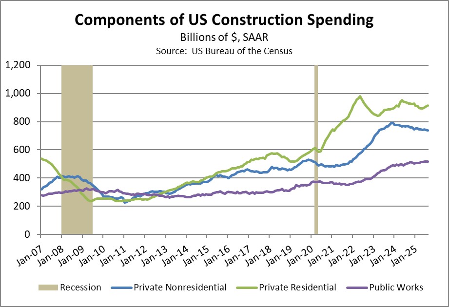 - The weakness in private commercial construction may seem odd against the backdrop of massive spending on data centers and other artificial-intelligence infrastructure. We think the year-over-year decline in total commercial construction reflects significant weakness in corporate building outside the AI space.