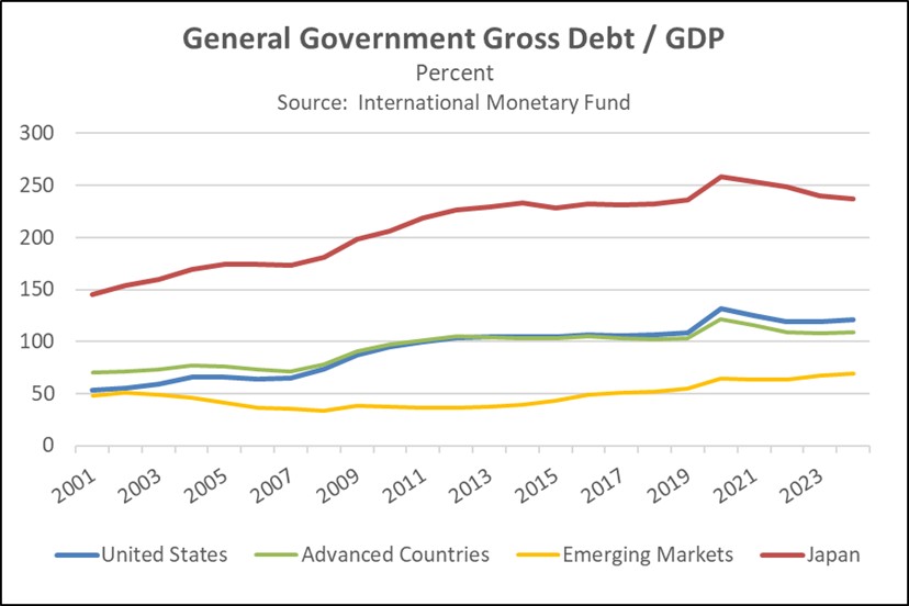 This privilege has afforded more than just insulation; it has effectively enabled developed nations to finance persistent, massive deficits without the immediate specter of a financial crisis. By issuing long-term debt denominated in their own reserve currencies, these nations have utilized a strategy of “extend and pretend,” rolling over maturing obligations while indefinitely deferring the structural reforms necessary for long-term solvency. This buffer is most glaring in Japan, which has sustained a gross debt-to-GDP ratio exceeding 200% for years with no imminent crisis in sight.