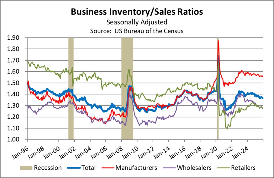 Equally noteworthy, the decline in price inflation since the early 1980s has made inventories less needed. Indeed, the chart above shows a long, steep decline in inventory ratios starting in the early 1980s when the Federal Reserve under Chair Paul Volker hiked interest rates and Congress passed a series of deregulation bills, both of which slashed price pressures on the economy. Just as important, the chart clearly shows how rising inflation in the 1960s and the energy crises of the 1970s prompted a big jump in inventory holdings equal to about 1% of GDP. The chart also shows that after commodity prices surged around 2005, firms boosted their inventory holdings. That inventory investment was short-circuited by the US housing crisis, but once the recovery started, inventories climbed back to almost 14% of GDP.