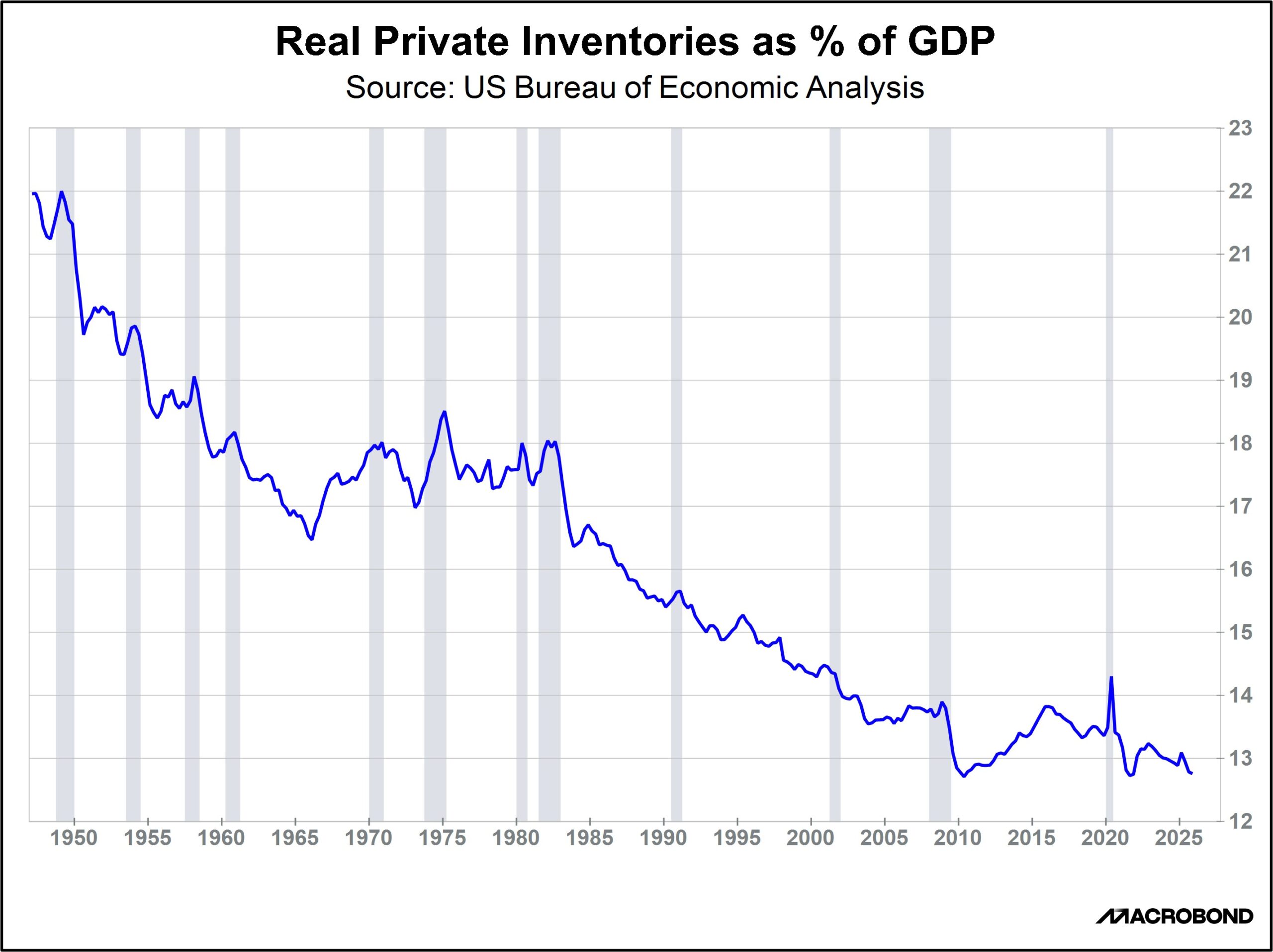 The chart above shows the inflation-adjusted value of US private sector inventories as a share of gross domestic product (GDP) since the end of World War II. Clearly, the overall trend has been for companies to hold less inventory compared with their sales. What explains this? We believe many factors are responsible. For example, the extremely high inventories around World War II and the Korean War probably reflected hoarding at a time of limited consumer sales. Inventory holdings would have naturally fallen as the end of those conflicts allowed for normalized supply dynamics and rebounding consumer spending. At the same time, innovations in transportation quickened delivery times and reduced freight costs, while the information technology revolution improved the ability of firms to optimize inventory holdings. And, as we’ve argued many times before, the end of the Cold War convinced many business managers that global peace was at hand and that competing in the era of globalization required using just-in-time inventory management.