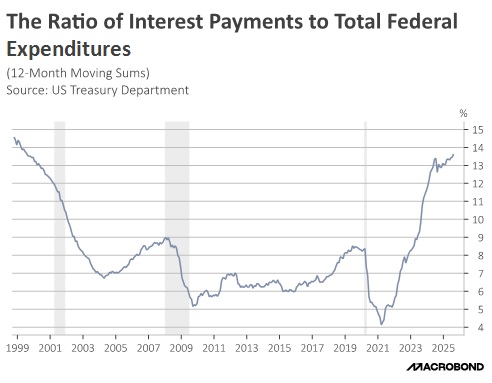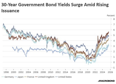 The bond market’s core assumption — that it would curb government overspending — has been severely tested since the pandemic. The initial, one-time surge in borrowing was necessary to prevent a global economic collapse. However, that precedent has been exploited. Many governments now use debt to finance a variety of pet projects, from infrastructure and green initiatives to energy subsidies and tax cuts. This increase in spending, detached from any corresponding increase in tax revenue or spending cuts, has been the primary driver behind the recent increase in bond yields around the world (see chart below).