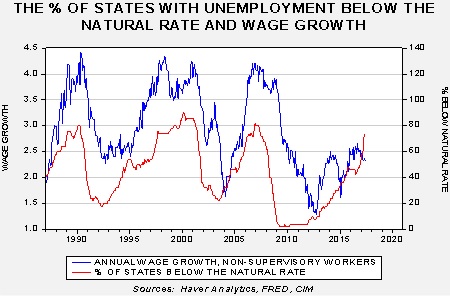 Over the same time frame, real wage growth was 0.26%, but when the percentage of states with unemployment below the natural rate exceeds 65%, real wage growth is 1.04%. As the chart shows, real wage growth is consistent with tight labor markets as defined by the percentage of state unemployment rates below the national natural rate.