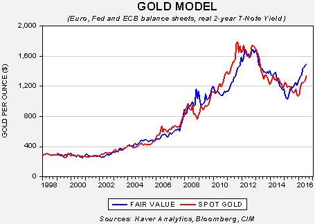 The model uses the EUR/USD exchange rate, inflation adjusted two-year T-note yields and the balance sheets of the European Central Bank (ECB) and the Federal Reserve. Including the latter two variables generally accounts for investor expectations of future inflation and interest rates. The current fair value for gold, based on this model, is $1,489.26, suggesting that current prices, though elevated, are not overvalued.