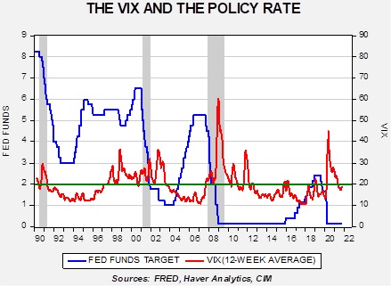 Above is a weekly chart of the fed funds target rate and the weekly VIX, smoothed with a 12-week moving average. We have placed a line at the 20 level for the VIX. In the late 1990s, the FOMC raised the target rate despite the VIX persistently trading over 20. At the onset of the 2001 recession, the FOMC dramatically cut the fed funds target and kept cutting until the smoothed VIX fell below 20. It only began raising rates with the VIX comfortably under 20. Its easing cycle started before the recession began in December 2007, just after the smoothed VIX rose above 20. The FOMC waited to raise rates after the smoothed VIX fell below 20, although it did begin to taper its QE in 2013. When the first rate hike began in December 2015, the smooth VIX jumped over 20, and the FOMC waited for several months until it fell below 20 before resuming the tightening cycle. That tightening cycle ended once the smoothed VIX moved over 20. The easing cycle did begin in Q3 2019, with the VIX under 20, mostly due to a problem in the money markets. Of course, easing accelerated as the smoothed VIX soared due to the pandemic.