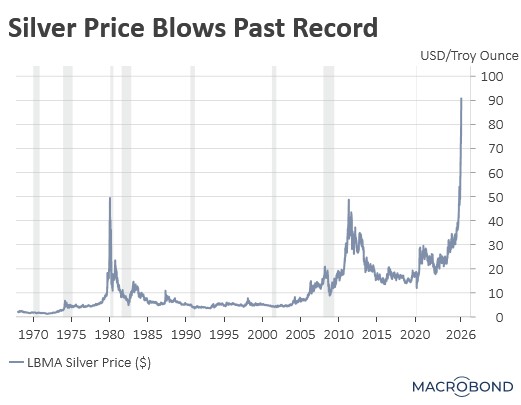 Prices for gold, copper, platinum, and silver have rallied sharply in recent weeks. The advances in gold and copper appear structurally sound, underpinned by persistent central bank accumulation and robust industrial demand, respectively. Silver typically takes its directional cue from gold but tends to exhibit greater volatility. However, the current price increase appears to be at least partially driven by a deepening supply deficit. Investors are increasingly concerned that “paper” silver obligations vastly outpace available physical holdings, which has driven the price up nearly 200% over the past year as market participants scramble for remaining inventory.