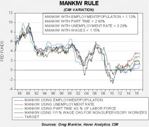The blue line on the chart shows the ratio of hires to openings; when the ratio is below one, it means there are more openings than hires and would suggest a tight labor market. The JOLTS report doesn’t have a long history but the ratio has never been this low. Note that the previous business cycle low, in 2006, led to wage growth of 4%. It is shocking that labor markets can seem to be this tight and wage growth remain subdued. It may be that labor fears of being substituted for machines or the huge pool of discouraged workers are keeping wage growth low, but, clearly, firms are looking for workers and struggling to fill positions. Basic economic theory would suggest that if demand is this strong, the price of labor should rise unless the supply curve is perfectly flat; if that were the case, the openings would be filled. This gap will likely encourage the FOMC that the proper course for monetary policy is to tighten further.