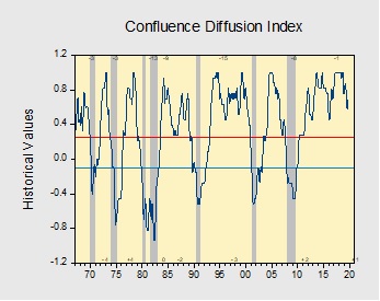 Data released for August suggests the economy is still in expansion, but a slowdown in manufacturing and signals of financial weakness continue to be a drag on the index. Currently, our diffusion index shows that nine out of 11 indicators are in expansion territory, with several indicators approaching warning territory. The index has fallen from +0.636 to +0.575.[1]
