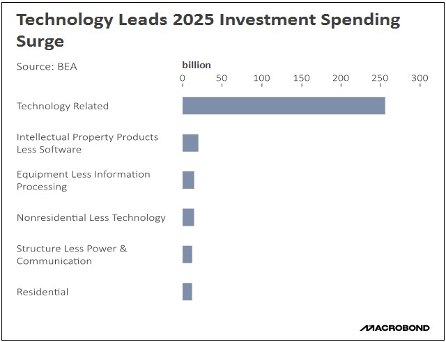 • The growing ubiquity of AI investment has become a crucial pillar supporting the broader economy. In fact, when looking at overall investment spending, the tech sector has dwarfed all other segments of the economy throughout 2025. This high level of spending is likely to continue into the current year, as major tech companies — including Alphabet, Meta, Amazon, and Microsoft — have all revised their capex expectations upward to meet the demand for AI.