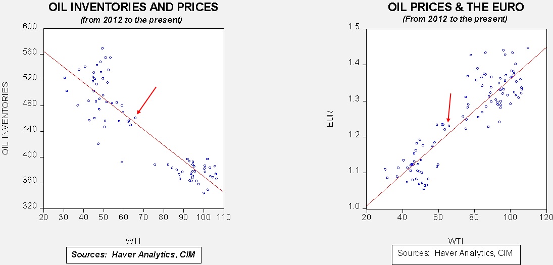 Based on inventories alone, oil prices are undervalued with the fair value price of $64.31. Meanwhile, the EUR/WTI model generates a fair value of $74.12. Together (which is a more sound methodology), fair value is $70.86, meaning that current prices are below fair value. Using the oil inventory scatterplot, a 422 reading on oil inventories would generate oil prices in the high $70s to low $80s range. At present, we have no reason to believe that inventories won’t follow their usual path so, barring an increase in supply or a sharp rise in the dollar, the case for higher oil prices is improving.
