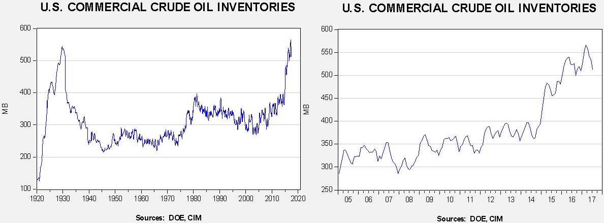 This chart shows current crude oil inventories, both over the long term and the last decade. We have added the estimated level of lease stocks to maintain the consistency of the data. As the chart shows, inventories remain historically high but they are declining. Again this week there was no oil sold out of the Strategic Petroleum Reserve. The authorized sale is nearly complete, as 16.2 mb have been released out of an authorized 17.0 mb.