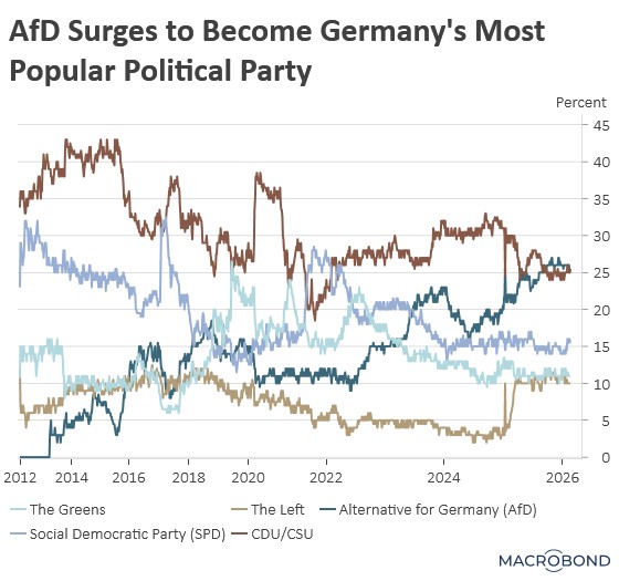 - Her anticipated resignation comes amid mounting discontent with incumbent lawmakers, whose popularity has deteriorated across the European Union, particularly in France and Germany. The French prime minister’s approval rating has fallen to historic lows, while support for Germany’s ruling CDU/CSU has eroded as voters gravitate toward ascendant populist parties such as the AfD and the Left Party, raising the prospect that movements once seen as fringe could move firmly into the European mainstream in the years ahead.