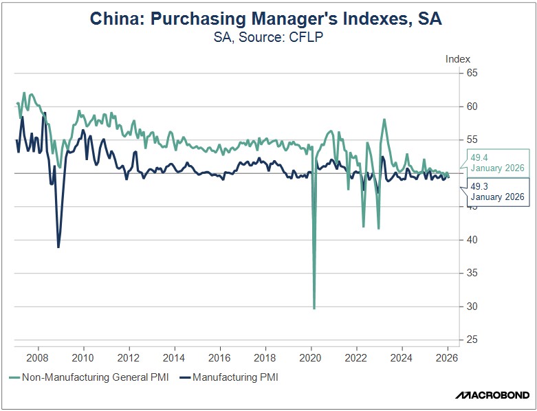 China: The official purchasing managers’ index for manufacturing fell to 49.3 in January, short of expectations and down from 50.1 in December. The non-manufacturing PMI fell to 49.4 from 50.2. Like most major PMIs, China’s is designed so that readings over 50.0 point to expanding activity. The data therefore suggests the Chinese economy is contracting again, largely due to weak demand among domestic consumers and businesses.