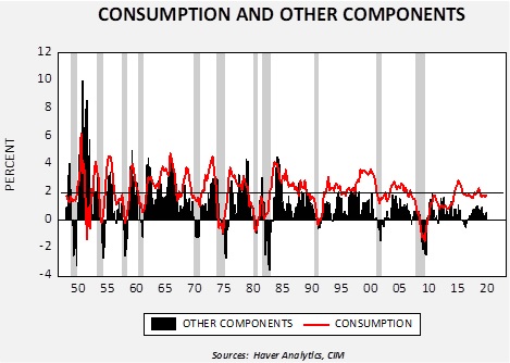 This sort of decline suggests equity markets are anticipating recession.  Is this reasonable?  The key, from where we sit, is the reaction of consumers.  As we have noted before, U.S. GDP has become unusually reliant on consumption.