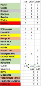 These are our estimates of policy leanings, with 1=most hawkish to 5=most dovish. We are assuming both of the new candidates are extreme doves (otherwise they wouldn’t have been nominated), with Waller being a traditional dove while Shelton is a political one. This means that if there is a change in administration, Shelton could become less dovish. The governors now are leaning dovish (going from 3.00 to 3.57) and the overall voting changing from 2.90 last year to 3.33 this year. This means that the hurdle for rate hikes has increased markedly. We would view these nominations as bullish for risk assets.