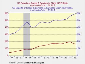Trade: The focus on trade is now shifting to the EU. The EU’s tactics up to this point have been to offer modest proposals and avoid direct confrontations with the U.S. This action is similar to how China initially dealt with the White House, but clearly the administration was not placated. So far, Treasury Secretary Mnuchin and Commerce Secretary Ross have been the point persons in the U.S. to the EU. This was true with China for a while. But, the real “game” doesn’t start until USTR Lighthizer shows up. This trade situation could get quite messy. First, we are only nine months away from U.S. elections; the EU likely hopes it will deal with a new president. Second, the EU is, by design, a slow-moving body and it isn’t obvious it can react quickly if the U.S. starts applying tariffs. Third, the EU really wants to apply digital taxes; we suspect this will be a red line for the U.S. Fourth, the EU is considering CO2 border adjustment taxes, which would apply a tax on the EU but also to imports based on the carbon policies of their trading partners. This action would be an anathema for the U.S. Fifth, U.S. exports to the EU are much higher than China; on a rolling-four quarter basis, it is 3.7x larger. Thus, the EU will have many more targets to apply retaliatory tariffs on the U.S. compared to China.