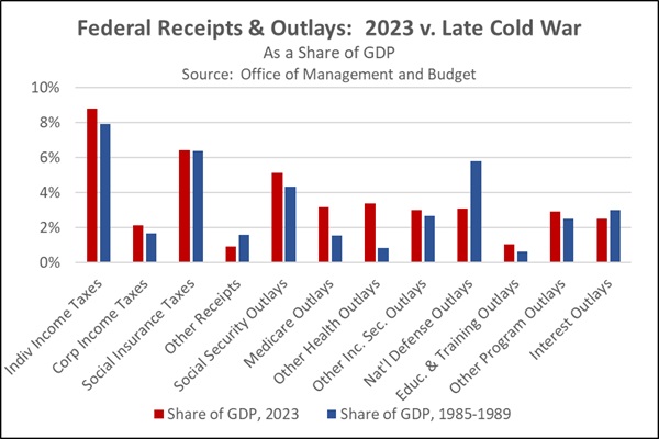 - How would this look? To start scoping out the prospects, we conducted a quick analysis of how the US federal budget would look in an environment like the late Cold War. In the chart below, we show the Office of Management and Budget’s estimated fiscal year 2023 federal receipts and outlays as a share of gross domestic product and compare them to their average shares of GDP in 1985-1989.