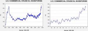 This chart shows current crude oil inventories, both over the long term and the last decade. We have added the estimated level of lease stocks to maintain the consistency of the data. As the chart shows, inventories remain historically high but the seasonal withdrawal phase has begun. We also note that, as part of an Obama era agreement, there was a 0.5 mb sale of oil out of the Strategic Petroleum Reserve. This was part of a $375.4 mm sale (or 8.0 mb) done, in part, to pay for modernization of the SPR facilities. International agreements require that OECD nations hold 90 days of imports in storage. Due to falling imports, the current coverage is near 140 days. Taking that into account, the draw would have been 5.8 mb, which is even more below expectations.
