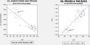 [1] It also suggests some collinearity issues, in that the two independent variables applied together yield a lower price than what each generates separately. In fact, oil inventories and the euro are inversely correlated at -72.0% since 2012. Thus, the dollar’s recent strength usually occurs with rising oil inventories. However, so far, this hasn’t occurred, likely for the reasons noted above.
