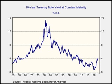 - Ten-year Treasury yields have risen over 100 basis points since April, to levels not seen since 2006. This massive jump in interest rates reflects investor concerns about the Federal Reserve’s ability to maintain price stability and the government’s ability to meet its debt obligations. Although the recent CPI report showed signs of improvement in underlying price pressures, rising energy prices have raised concerns that some of this progress will be reversed. Additionally, growing partisanship prevents Congress from passing legislation to address the growing government deficit. As a result, investors are demanding higher yields to compensate for the increased risk.