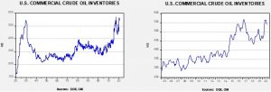 The above chart shows the annual seasonal pattern for crude oil inventories. This week’s data showed another decline in crude oil stockpiles. We are approaching the end of the seasonal withdrawal period. Although the declines of the last few weeks are supportive, stockpiles remain well above seasonal norms and remain a bearish factor.