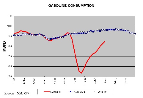 Gasoline consumption remains below average, but the recovery is unmistakable.