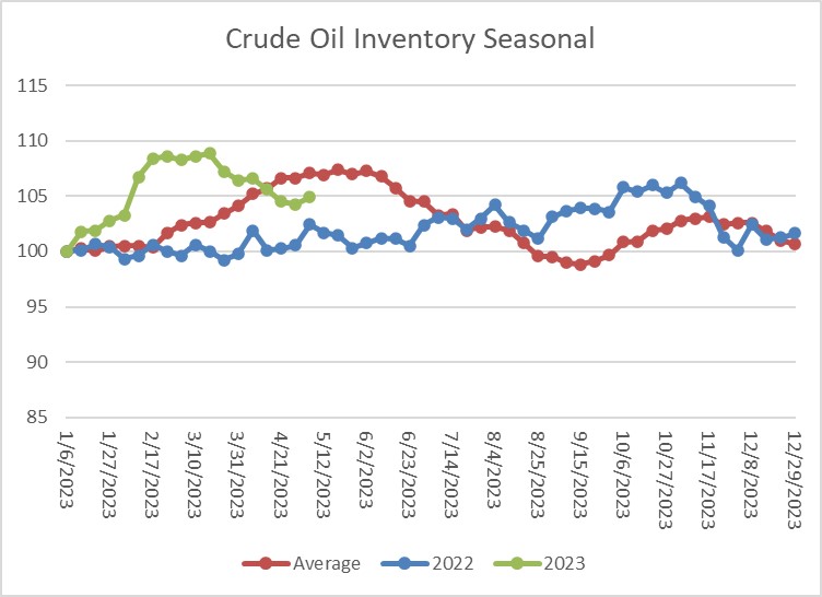 The above chart shows the seasonal pattern for crude oil inventories. After accumulating oil inventory at a rapid pace into mid-February, injections first slowed and then declined. This week there was an increase, although storage levels remain below seasonal norms.